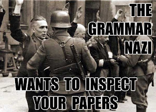 While proper grammar usage is all well and good, a Grammar Nazi cavils even insignificant errors in English to somehow win an argument. Of course, rather than being genuinely persuasive in an argument, pointing out English errors is a weak attack only on the typist's credibility and never has any bearing on the underlying premises and assertions therein.